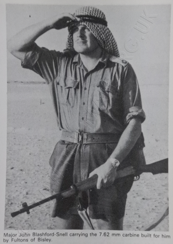 As an adjunct to this page's subject, there was an article in the December 1975 issue of the now defunct "Guns Review" magazine that covered the firearms used by the well-known explorer Major John Blashford-Snell. For many years he carried a No.1 Mk.III .303" SMLE on his expeditions, as well as a BSA Sportsman Five .22RF rifle, stating his preference for bolt-action rifles (and particularly not tube magazines). When seeking a more powerful but lighter and handier full-bore rifle, he approached Fultons gunsmiths at Bisley Camp in Surrey, and to meet his requirements they converted a No.5 carbine to 7.62mm for him, utilising a No.4 rifle butt with a proprietary recoil pad, a Sterling magazine and a target-shooting type wide webbing sling. The flash hider was retained as he felt it helped to better contain muzzle blast.