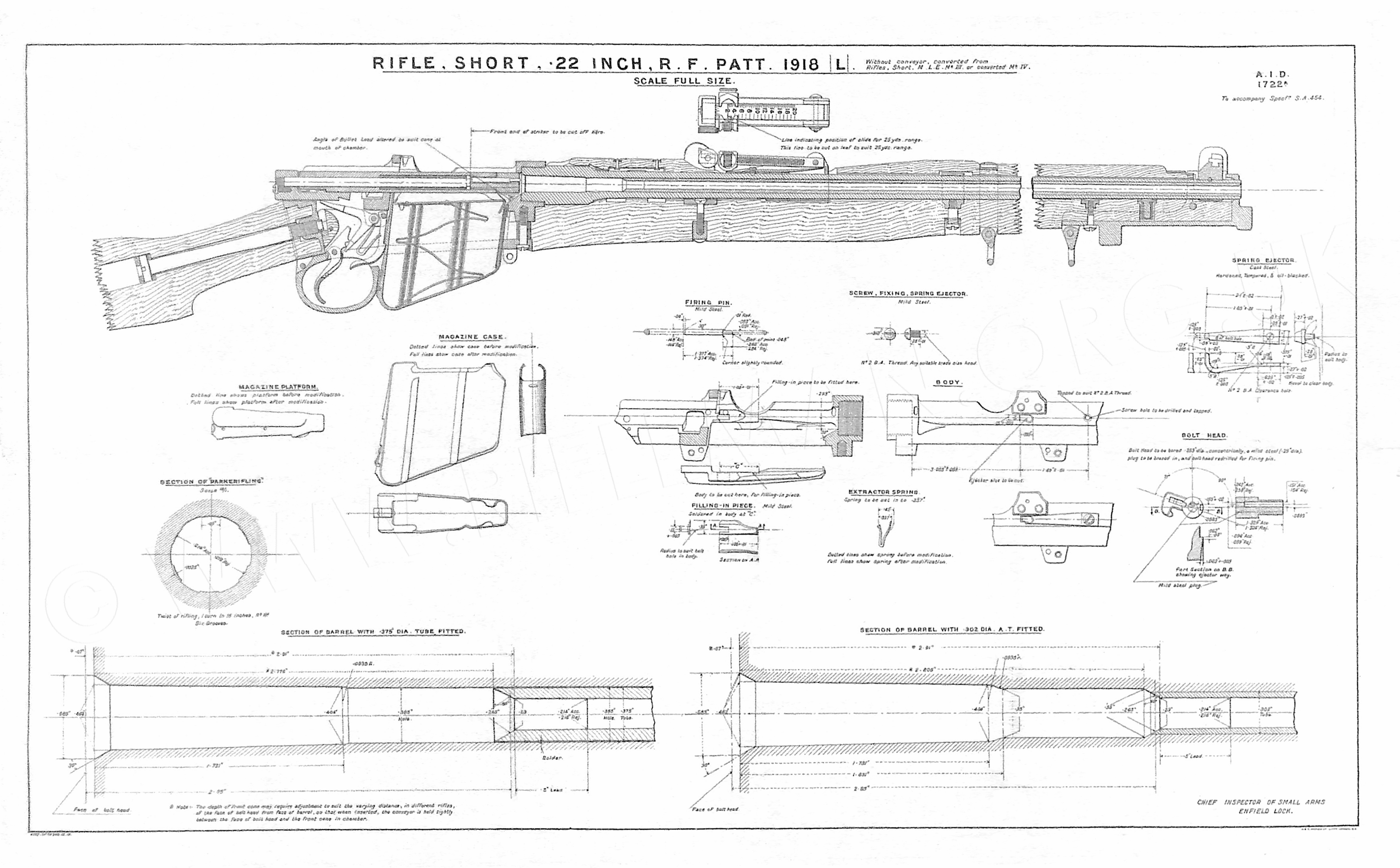 The specification for the Pattern 1918 rifle was issued in a Small Arms Document referenced SA 454. This confirmed approval for the rifle on 27th. January 1919. There were two SAID drawings associated with the specification, one for the rifle, components and chamber detail, and one for the conveyor and an unloading tool that was perhaps superceded by the one shown above. The former was Drg No. AID 1722A and the latter AID 1723, both dated at December 1918.
