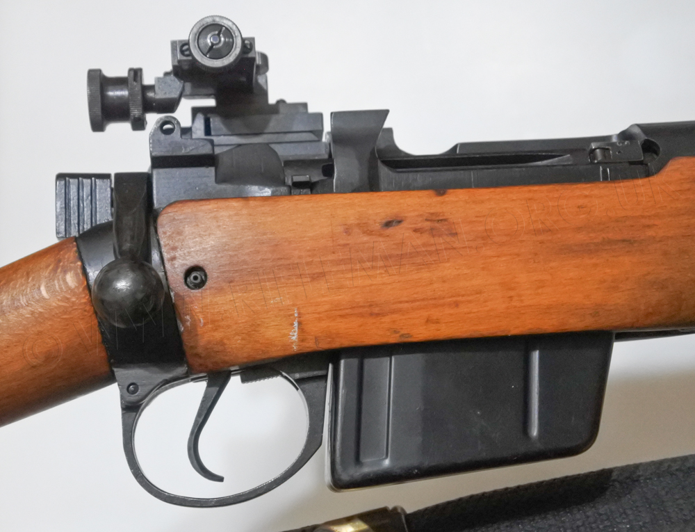 Initially the .303CF magazine was retained and just used as a loading platform. Those rifles assembled subsequent to serial no. A100 had the magazine well and trigger-guard machined for the fitment of the 7.62mm Sterling type magazine.