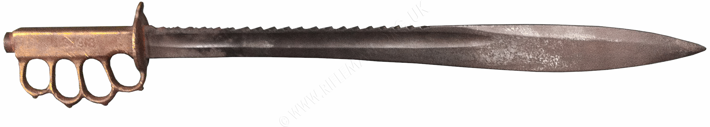Only loosely associated with this page's subject rifle, but a highly unusual item was spotted by us a few years ago at a London Arms Fair. This Elcho bayonet had been fitted to the knuckle-duster handle of a First World War 1918 dated U.S. standard issue Mk.1 trench knife, increasing its length, weight and lethality near fourfold. The latter knife is itself a rare beast nowadays, but the combination, presumably a WW1 adaptation, must be approaching unique.