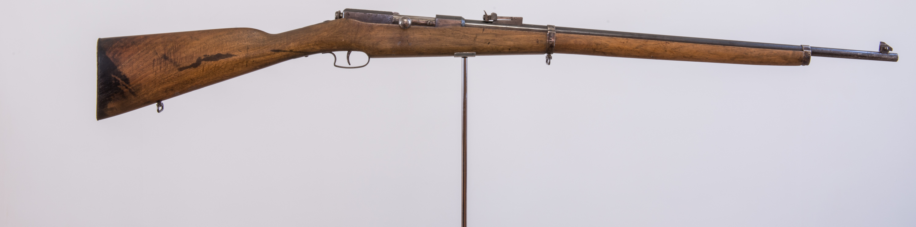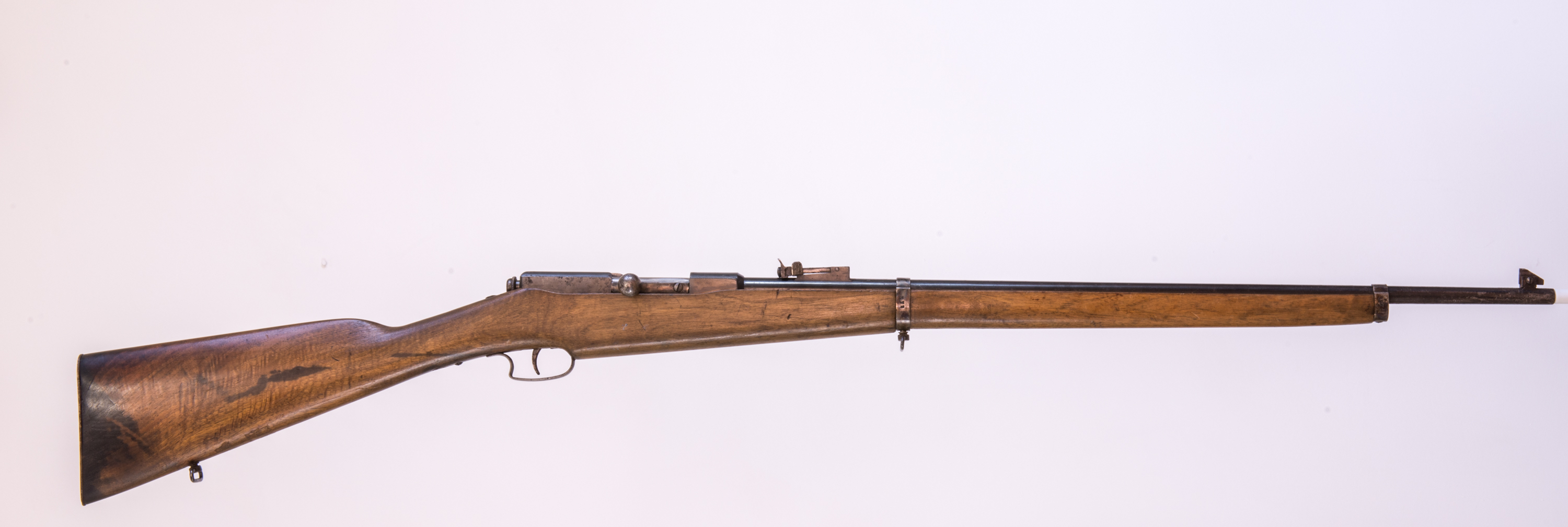 The rear-sight, with its windage adjustment, the barrel, barrel bands and fore-sight are certainly all from the same stable. One major difference, though, is the two-part fore-end wood, which has a steel linking piece with wedged lugs. This part is let into the barrel-groove in the wood, and is drilled and threaded to take the combination bedding bolt/sling-swivel which, in common with the aforementioned Lebel trainer, does not fasten into the underside of the barrel, but does locate the rear barrel-band.