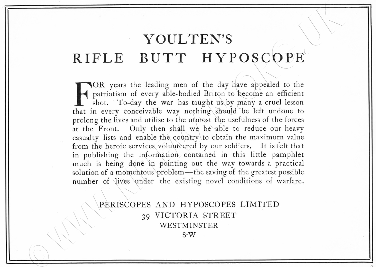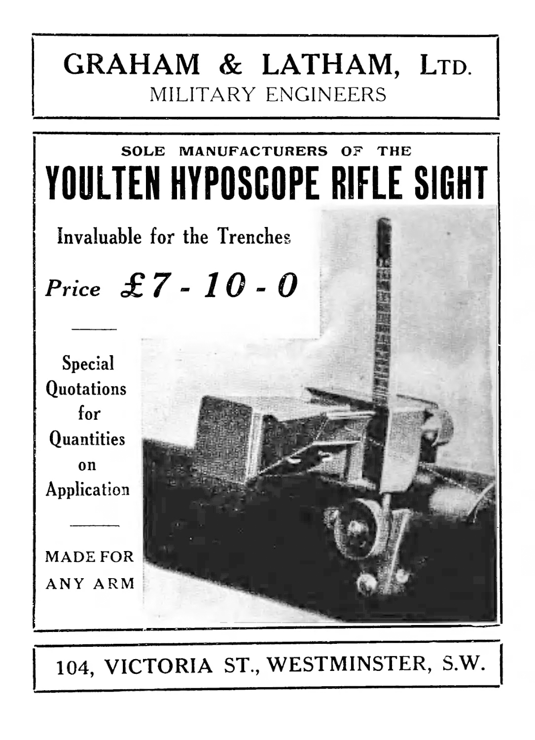 Youltens' inventive ideas for sighting aids were prolific, and he subsequently designed an elaborate rifle optical system along the lines of the Lattey, Neil and Gibbs Galilean products, but again also for possible utlisation on a machine gun.