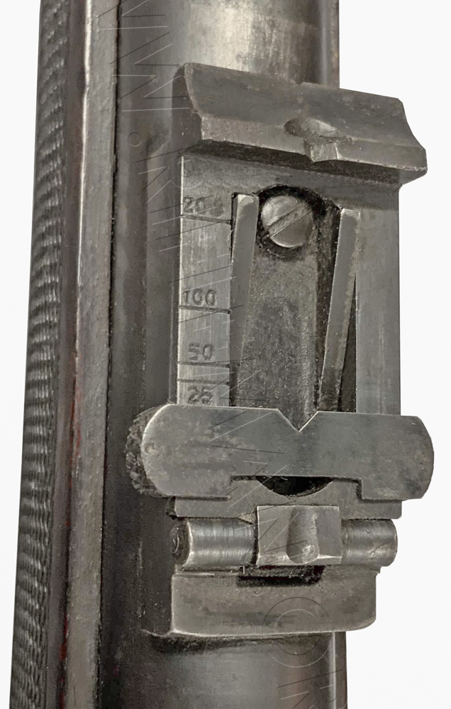 and folding-leaf rear-sight with "V" notched leaves for 25, 50 and