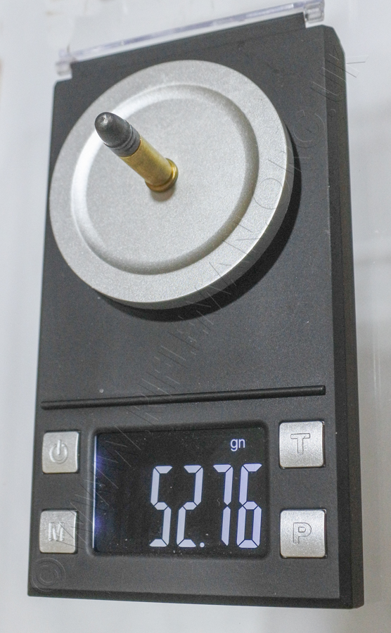 and the weight of the cartridges lies between 52.70 and 52.95 grains.