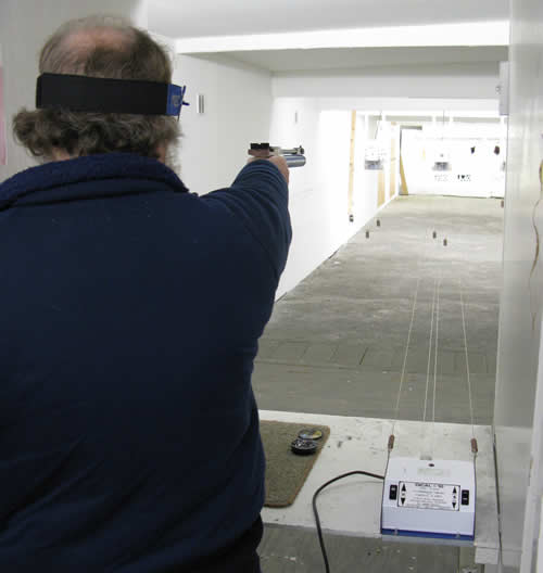 The electronic target deployment control box can be seen above on the bench beside the shooter.