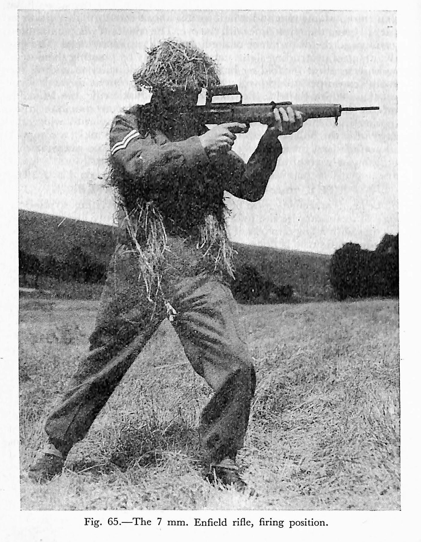 A photograph of the rifle is shown in Figure 63. Modern warfare demands a lighter weapon than has been used in the past; the weight of the 7 mm. rifle is about 8-} pounds. The rifle and cartridge have been especially designed for a specific purpose and include the best features selected from other weapons. The .303 in. cartridge is 3 inches long and the 7 mm. has been reduced to 2-} inches; the reduction allows a shorter feed stroke and assists in shortening the overall length of the rifle. The bullet weight is 140 grains and the muzzle velocity is 2530 feet per second. The illustration shows that a straight-through design has been adopted together with a telescopic sight mounted at a convenient height. The sight mounting has been built in the form of a carrying handle so that the telescope is automatically protected to some extent. It has unit magnification which in addition to eliminating all focussing difficulties (see Chapter 8, telescopic sights), allows a good view of the field offire. Iron sights are provided in case the telescope is damaged. There is no dead wood in the butt, the interior being fully occupied. The fore-end is made of wood and has a full left-hand grip to prevent the fingers reaching the hot gas cylinder; incidentally the grip provides an excellent hand hold for both shooting and bayonet fighting. The position of the breech is indicated by the front edge of the magazine and shows that the barrel is of normal length for the calibre, in spite of the short length of the rifle. The position of the twenty round magazine ensures that its weight is in the optimum place near the shoulder. There is no waist to the butt, as in conventional rifles, so a pistol grip has been fitted in a convenient location for the right hand, and a linkage operates the trigger. The safety catch is mounted in the front part of the trigger guard and is similar to that on the Garand rifle; it is operated by the back of the index finger. The weapon handles well in all firing positions, including the waist. Figure 65 is a photograph of the rifle in action.