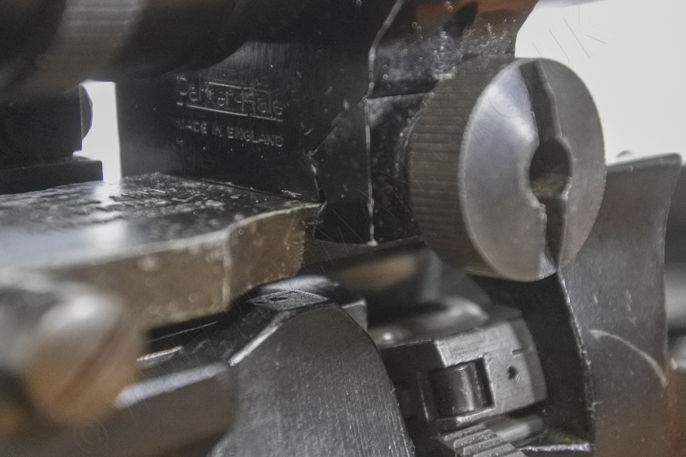 The Parker-Hale rear scope ring on their neatly designed BA 21 base that fits into the No.4 rifle leaf-sight pivot.