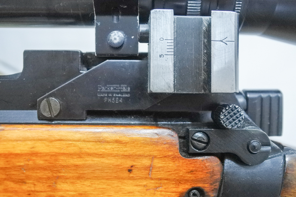 The Parker-Hale Model PH5E4 aperture sight mount was often retained on the rifle when the telescope was mounted, with the elevation slide necessarily removed to accommodate the telescope.