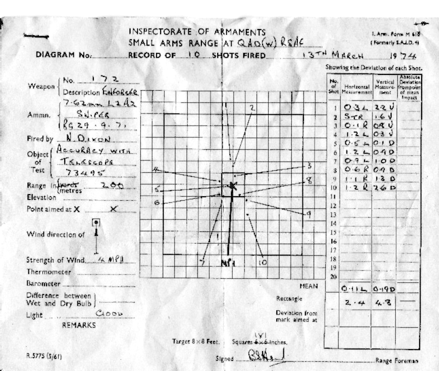 An original ten-round group test diagram fired in mid-March 1974, using rifle s/no. 172, at the Royal Small Arms Factory range in a 4mph following wind to check accuracy with the telescope. The group is just under 5" vertically and only 2.5" in azimuth.