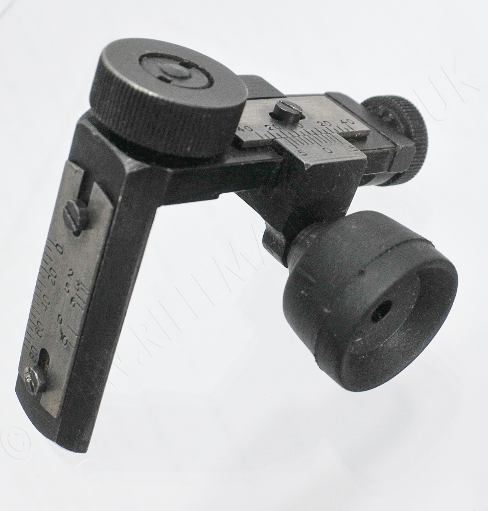 The separated upper section of the rear-sight showing the vertical elevation slide and the horizontal windage/azimuth slide with the eye-piece fitted with a rubber shade.