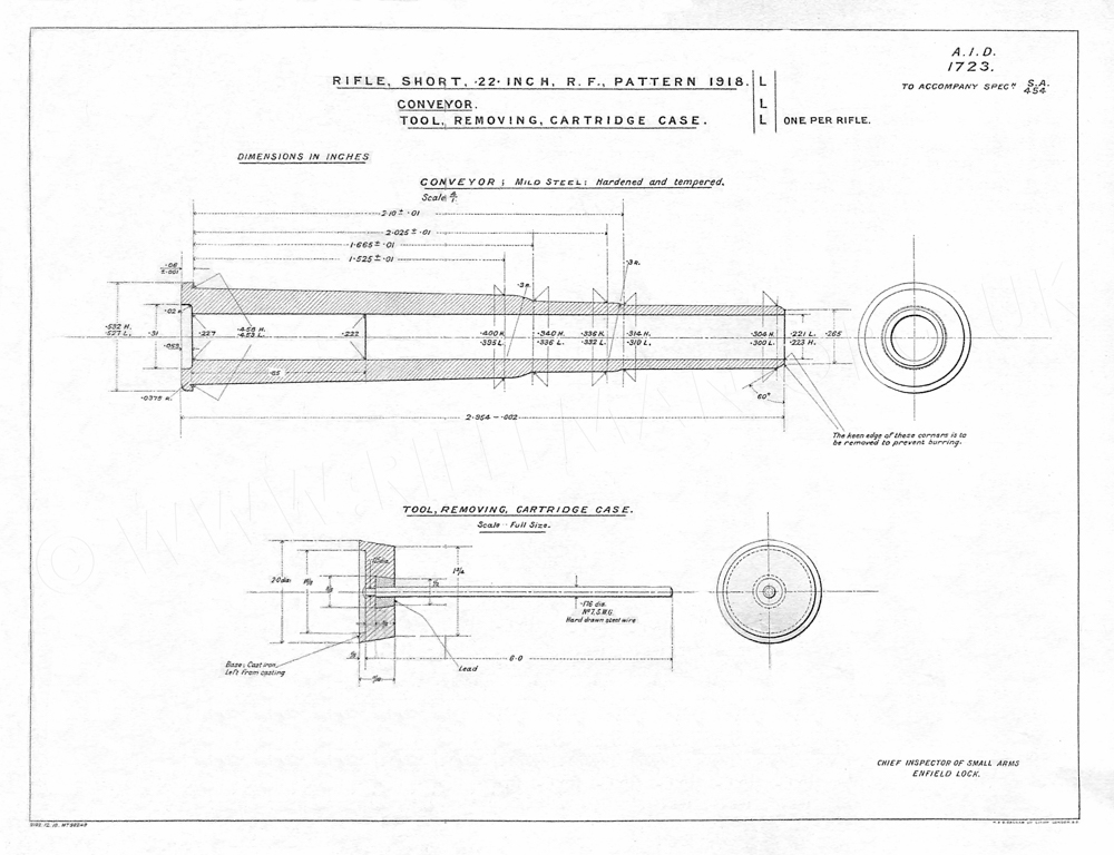 The specification for the Pattern 1918 rifle was issued in a Small Arms Document referenced SA 454. This confirmed approval for the rifle on 27th. January 1919. There were two SAID drawings associated with the specification, one for the rifle, components and chamber detail, and one for the conveyor and an unloading tool that was perhaps superceded by the one shown above. The former was Drg No. AID 1722A and the latter AID 1723, both dated at December 1918.