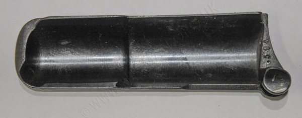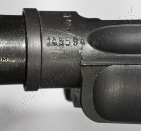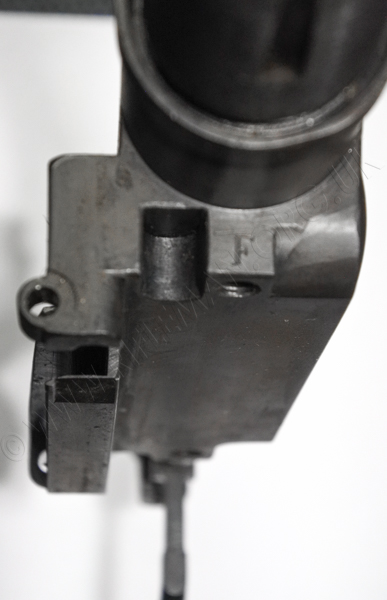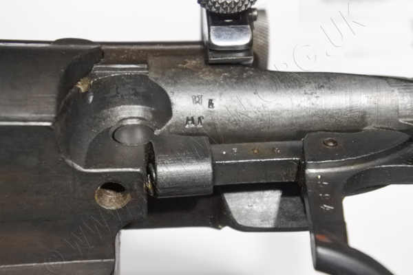 A single locking lug (8) is situated at the head of the bolt. On the right side, when the bolt is closed, is a solid rib (9) which, in the closed position, bears against a shoulder (10) of the body, and assists in taking the recoil. The lever (11), terminating in a knob (12), is at the rear end of and at right angles to the bolt cylinder. The lever is partly cut away on the right side to clear the body.