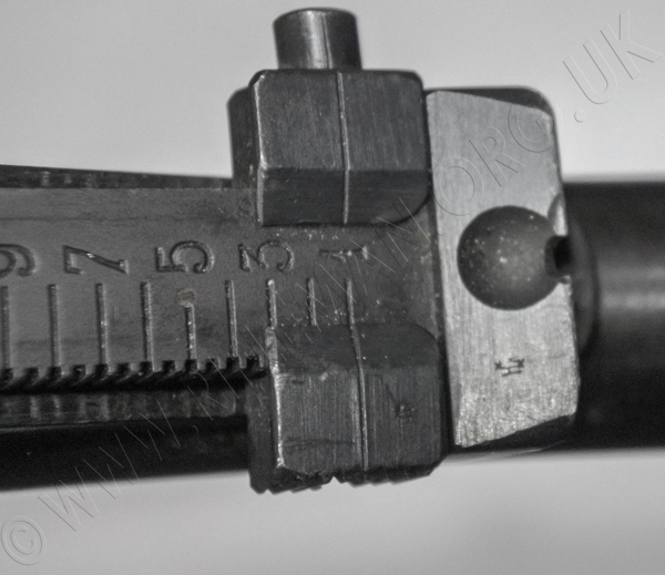 There are two V's on the slide, one for use leaf down, from 1 to 400 yards, the other for use leaf up, from 500 to 1,900 yards ; when aim is taken over the top of the leaf, 2,000 yards elevation can be obtained. A small hole is drilled through the slide below the V, forming an aperture sight, when the leaf is up, it can be used with the graduations marked on the face of the leaf from 100 to 1,800 yards, and is very useful for deliberate shooting.