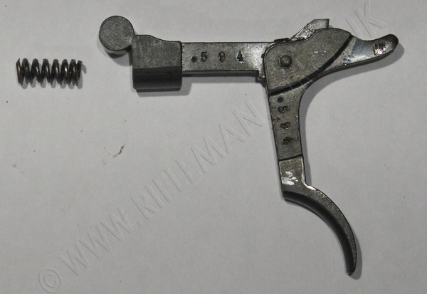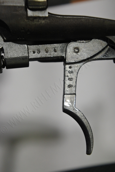 The trigger, K, is a bent lever with a recess on its upper surface in which the end of tho sear works. It is pivoted to the sear by the pin (46). It has two projections 011 its upper surface, which bear in succession against the underside of the tang and produce the double pull-off fully described in the Austrian Mannlicher.