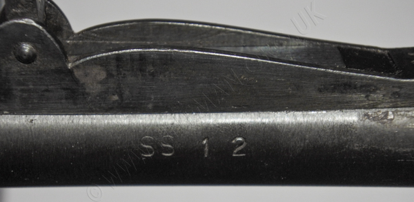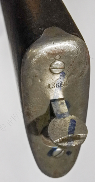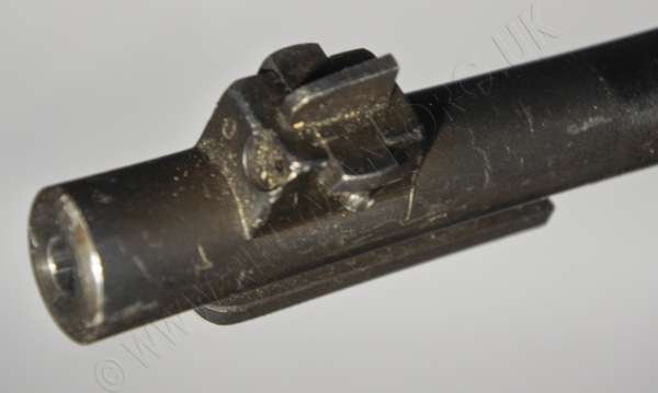 The upper band is secured to the fore-end by a screw passing through it. It is longer than usual, and has a strap at either end passing over the barrel. On its underside in front there is the usual sword bar, and in rear a piling swivel similar to that on the Lee-Enfield rifle. The lower band is split at the bottom, the ends being drawn together by a screw, on which is pivoted the sling swivel. The other sling swivel passes through a boss on a plate which is screwed to the underside of the butt. No cleaning rod is carried in the rifle.