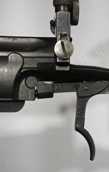 * A windgauge sight has been recently adopted for this rifle. The back- sight bed is divided horizontally into two parts; the bottom part is fixed to the barrel, the top part pivots on a vertical screw passing through it, into the lower part, about 3/4-inch from its front end. The rear end of the upper bed is circular, with the pivot screw as centre, it is held down by a rib projecting from its rear end, which works in a corresponding groove in the lower bod. A scale is marked on the rear end, and opposite each end of the scale are zero lines on the lower bed. The upper bed is clamped in any desired position by means of a nut with tliumbpiece, which bears on the front end of the bed. This clamping nut works on a vertical screw, projecting from the lower bed, through a curved slot in the upper bed.