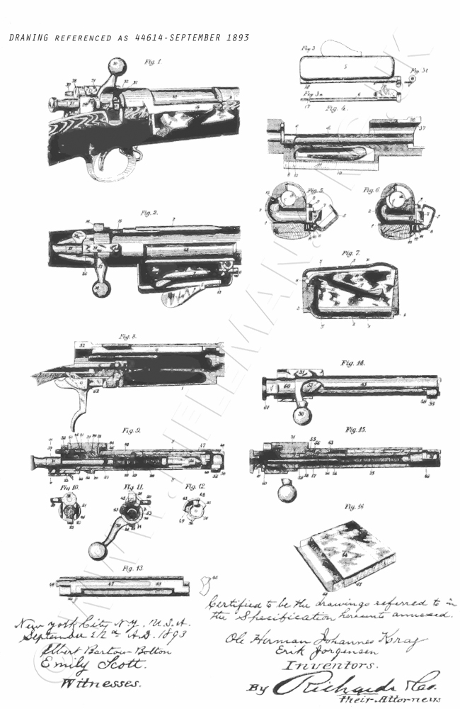 The earliest associate patent covering the sliding breech block design was the 1889 no. 18,430 by P. Jensen, in conjunction with Norwegians O.H.J. Krag and E.J. Jörgensen. Ole Krag was a director of the Kongsberg Våpenfabrikk arms manufactory, and Eric Jörgensen was a professional gunsmith.