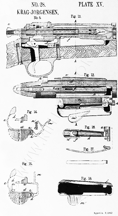 The bolt mechanism acts in an exactly similar manner to that already described in the Danish Krag Jörgensen, except that the ejector throws out the cartridge as above described, instead of striking the base of the cartridge.