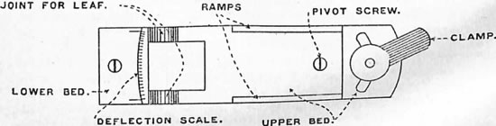 tudinal groove in the foresight block. The backsight bed is soldered and screwed to the barrel. The leaf is pivoted near its rear end, and is controlled by a flat spring screwed to the front part of the bed. The sides of the bed are formed into curved ramps which give elevations from 200 to 600 yards with the leaf down. The 100-yard graduations are marked and numbered on the left side of the bed and 25-yard graduations are shown by lines on the right side. The leaf is provided with a solid cap and with a slide which is clamped at any desired elevation by means of a screw with a milled head on its right side.