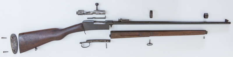 This disassembled parts image illustrates two particular points. Firstly, apart from the external profile of the receiver and the bolt's cocking-piece arrangement, the remainder of the rifle is constructed with parts that appear, to all intents and purposes, identical to parts of the as yet unidentified Nationale training rifle on we show on another page. Secondly, unlike the Nationale Rifle, the fore-end wood is in one piece.