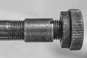 and the threaded sharp end of the .22 barrel tube, showing the .455 sleeved collar, the knurled tightening knob with its leather washer.