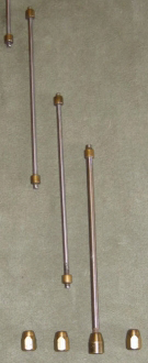 Once clamped to the rifle, the sub-target unit needs the "firing" mechanism to be put in place. This mechanism is about as basic as it could be. Effectively, an operating rod is fitted into the barrel. The rod has a threaded brass end which fits into the rifle's chamber at the rear and threaded adjustment section at the muzzle. In fact, to permit the components to fit into a reasonably sized box designed around the main unit, the rod is divided into sections, each with a bore diameter brass boss at each end. These slide - one after another - into the bore, and any free play is taken up by adjusting the front thread once the bolt has been replaced in the rifle and closed.