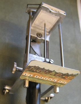 Below is the device fitted with its calibration plate. The rear of the plate drops into the target holding frame and the front section, with an inverted "V" cut-out, overhangs the point of the striking pin, as shown. The knurled knobs either side of the aiming mark landscape target can be adjusted to bring the sights of the rifle to the correct windage. The elevation adjustment is made by raising or lowering the foresight barleycorn, which is threaded into the separate clamping device which permits the alternate fore-sight to be affixed to the fore-end of the rifle ( see images above). It will be seen that the Mauser rifle's own foresight cannot be used since the whole sub-target unit clamps to the rifle around the fore-sight and its mounting block.