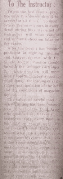 and consequently more rapidly corrected. It is an instrument that records not only the actual result of a shot made at a mark, but the position of the Rifle during the process of aiming and at the moment of pulling the trigger, and thus demonstrating to the instructor the reasons for a hit or miss on the objective target.