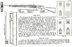 Above this head is placed a delicate rod with a universal movement. At the forward extremity of the rod a needle point is fixed, and in a little grooved frame a target, about the size of a visiting card, is placed. That is the Sub-target. The objective target is an ordinary one, placed preferably at 30 yards range, which is ringed to proper dimensions to appear the size of a standard target at any desired distance, say 200 or 500 yards.
