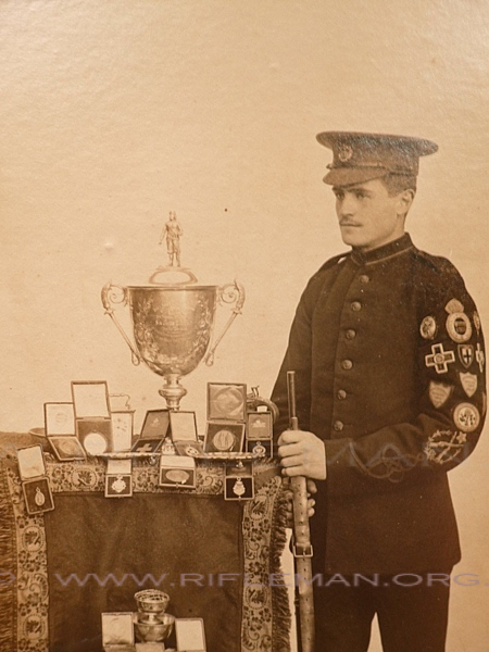 John Tippins won the National Service Rifle Championship in 1911. He was a contemporary both of L.Cpl. H. Ommundsen (later Captain) and of Arthur Fulton of Fulton's gunsmiths of Bisley Camp. Ommundsen won the King's Prize in 1901 and was five times winner of the Service Rifle Championship between 1905 and 1913. He also won the Bisley Grand Aggregate three times and was runner up twice between 1900 and 1912. Until four years ago, Arthur Fulton was the only man to win the King's / Queen's prize three times, a feat now shared by Alain Marion. In a poll taken around 1912, John Tippins was voted by his peers to be among the 10 best marksmen in the world. Sadly both John and L.Cpl Ommundsen were to be killed in the first year of the Great War. John, aged 27, shot through the heart while fetching water for a machine gun.