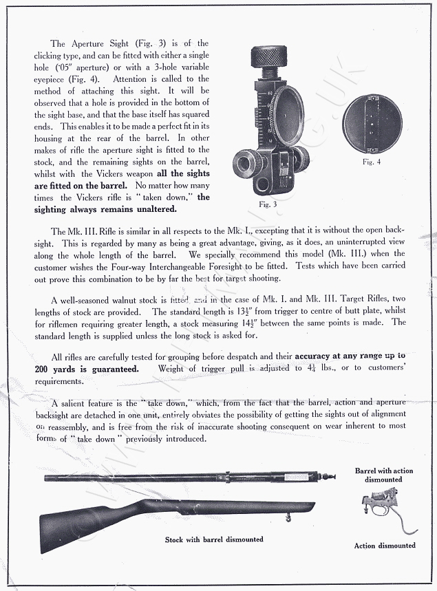 The Vickers company was not backward in publicising the successes of their rifles in competition. One page trumpets the World record score achieved by the renowned E.G.B. Reynolds (author of the post-war premier reference book for the Lee-Enfield Rifles - (see Bibliography) in the Dewar International event.