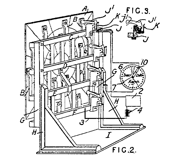 7980. Peters, G. A. April 6. Targets.-Fig. 2 is a diagrammatic view of the back of an electric indicating-target A, constructed of sections firmly secured by shanks B to crossbars C, D, E, F rigidly fixed to uprights G of brackets H on a base I. At the back of each target section is a contact-maker J(1), pivoted to a bracket J, and arranged to complete a circuit through an insulated spring plate K, an indicator 2 at the firing-point, a battery 4, a wire 3, and the frame of the target. The target sections are held rigidly, and do not move bodily, when struck, the levers J(1) being tilted by the force of impact, or vibrations of the plates. In order to test the apparatus, a challenge board 6 is provided at the firing- point, and a pointer 10 is moved over contact pins 7 so as to complete an electric circuit through each indicating-section in turn. The motion of the contact lever J(1) is limited by a projection of the lever coming in contact with a shoulder of the bracket J, and the lever is weighted at (1) to bring it back to its original position.